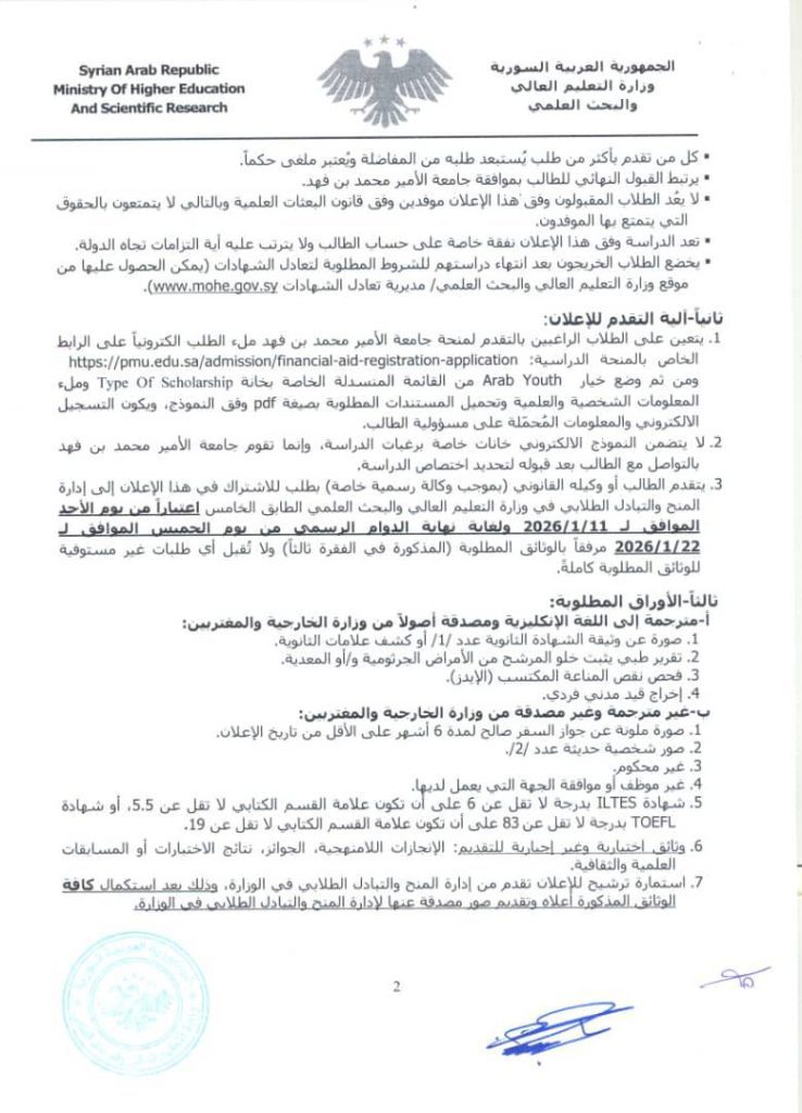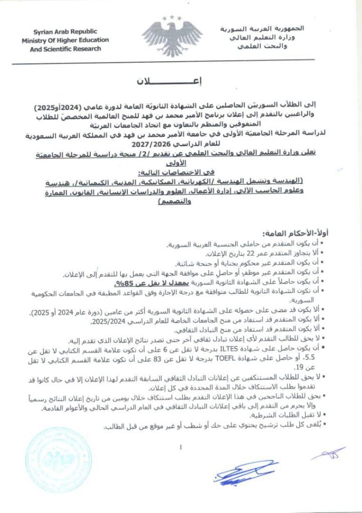 أعلنت وزارة التعليم العالي والبحث العلمي في سورية عن المنح الدراسية للمرحلة الجامعيّة الأولى في جامعة الأمير محمد بن فهد في المملكة العربية السعودية للعام الدراسي 2026/2027.