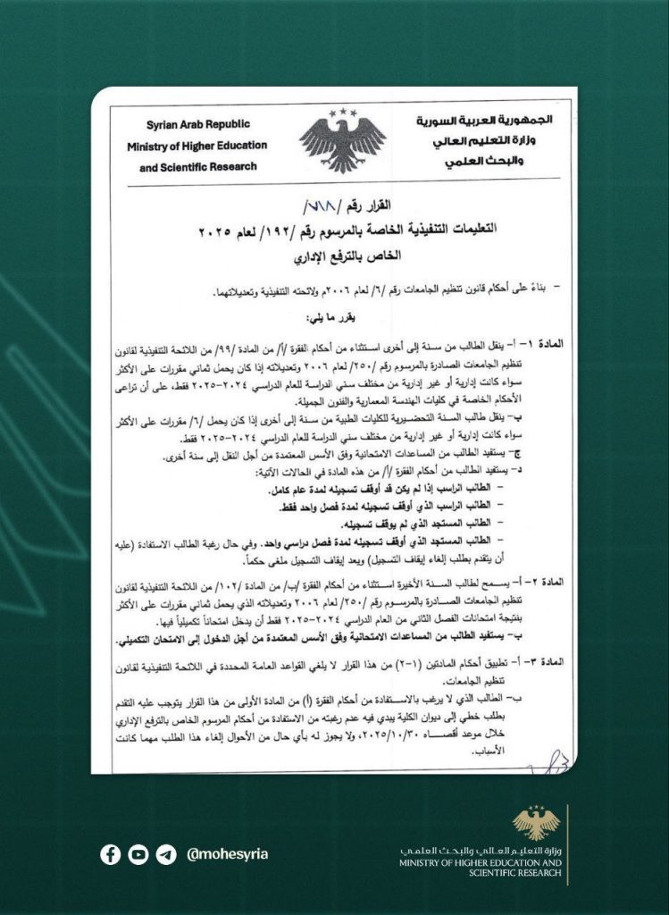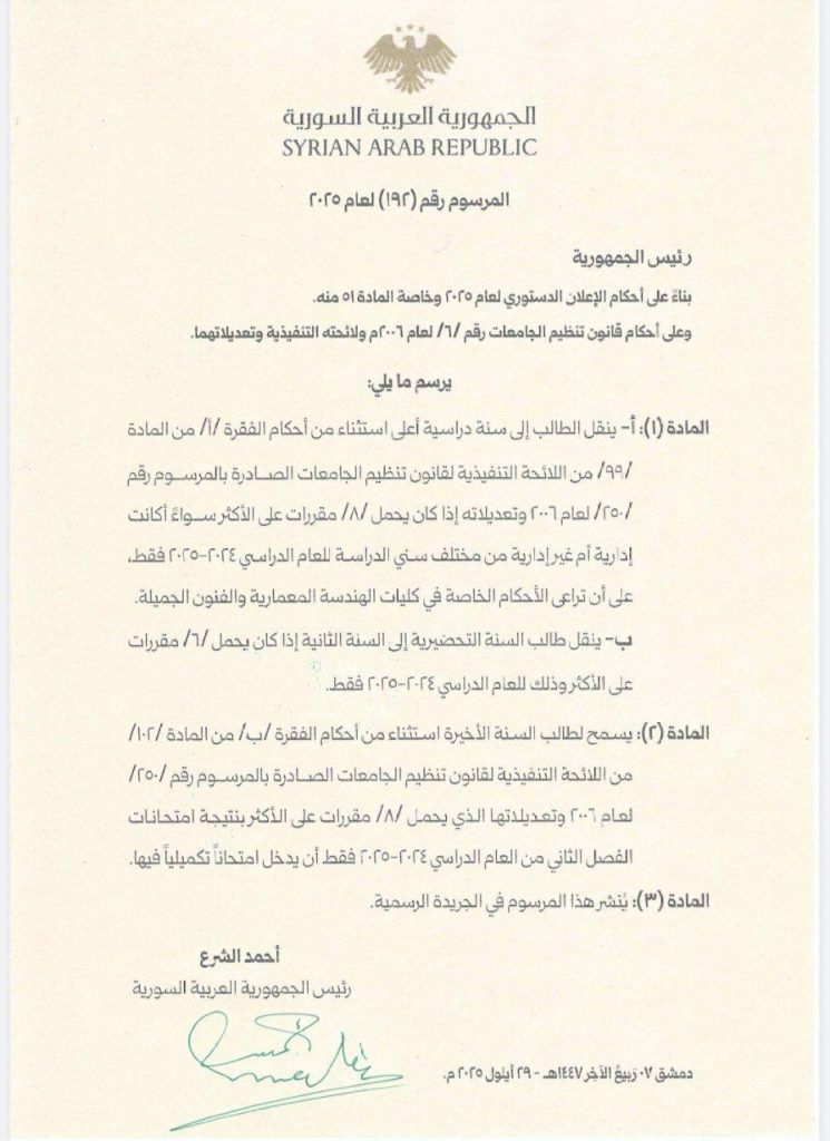 أصدر الرئيس السوري المرسوم رقم 192 لعام 2025 القاضي بمنح طلاب الجامعات ترفعاً إدارياً حتى 8 مواد، وطلاب السنة التحضيرية حتى 6 مواد، كما يتيح لطلاب السنة الأخيرة التقدم إلى الدورة التكميلية إذا كانوا يحملون 8 مواد للعام الدراسي 2024/2025.