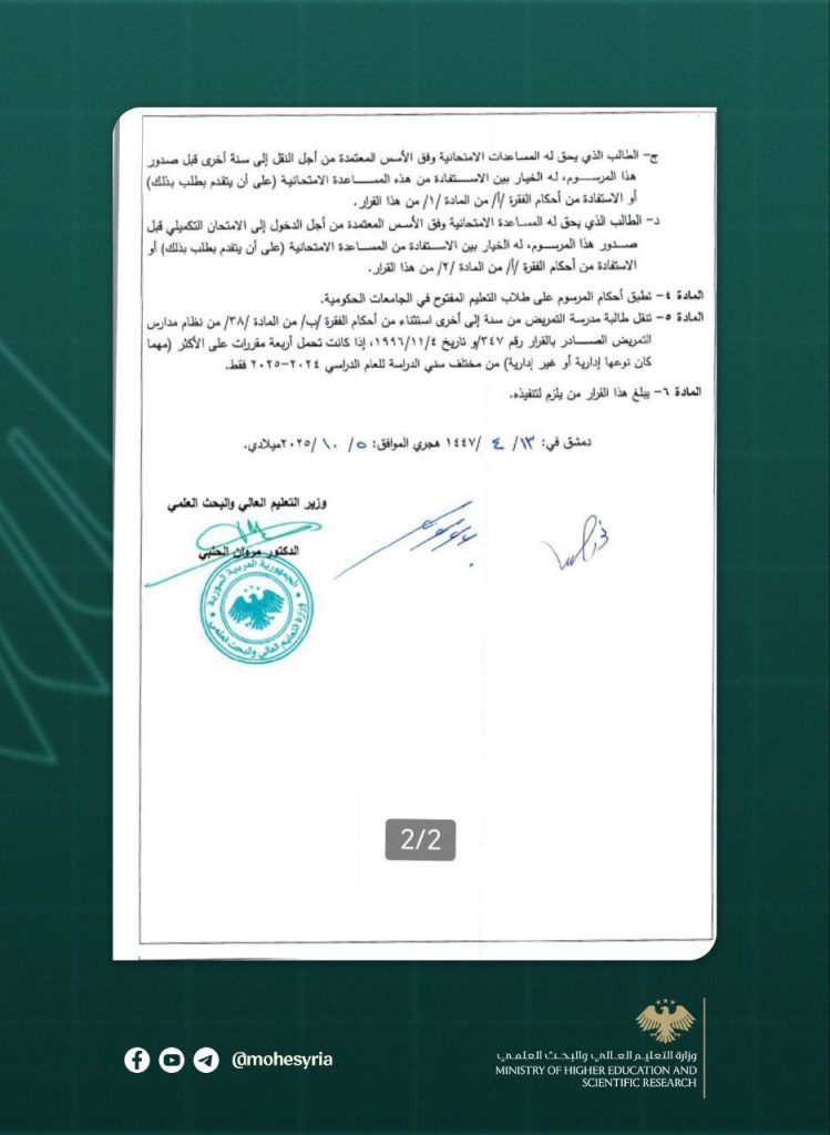 • القرار مبني على أحكام الدستور السوري وقانون تنظيم الجامعات، ويهدف إلى تحقيق العدالة الأكاديمية وتعزيز فرص النجاح والتقدم للطلاب.