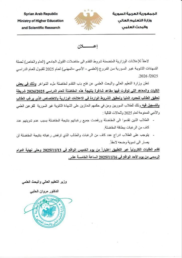 أعلنت الوزارة التعليم العالي اليوم الخميس (13 تشرين الثاني 2025) عن مفاضلة ملء الشواغر لحملة الشهادات الثانوية السورية وغير السورية الممنوحة من العام 2011 ولغاية العام 2024 للعام الدراسي 2025-2026.