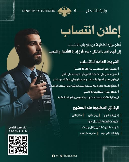 أعلنت وزارة الداخلية في سوريا في شهر تشرين الثاني 2025 عن فتح باب الانتساب بصفة أفراد لصفوف الأمن الداخلي، وذلك وفق المواصفات والشروط المحددة، ونضع لكم في نهاية هذا المقال الرابط المباشر للتسجيل.