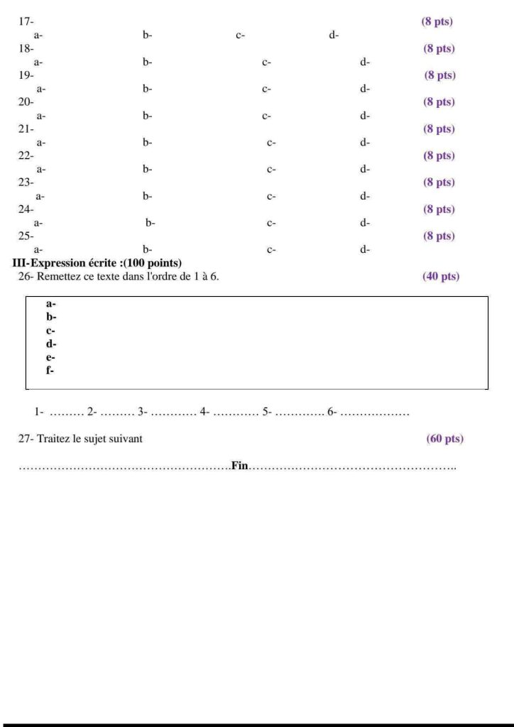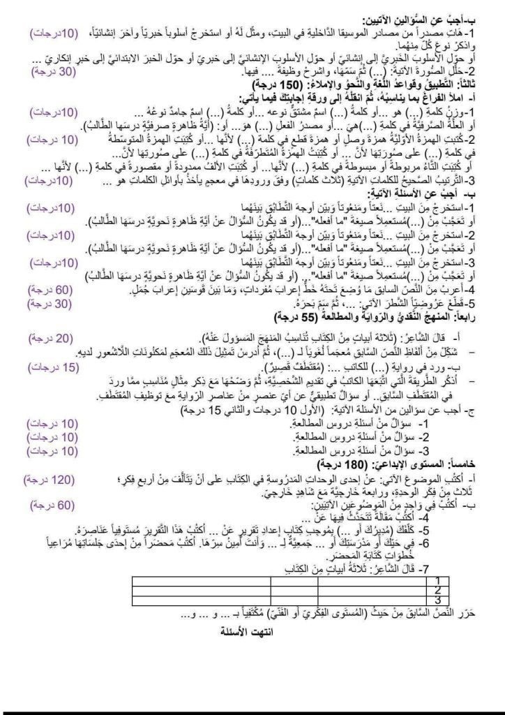 - اللغة العربية: تظل المادة الأضخم (600 درجة). تم تنقية المنهج من النصوص ذات الطابع السياسي المرتبط بالنظام السابق واستبدالها بنصوص أدبية عالمية وعربية كلاسيكية. يركز النموذج على تحليل النص، القواعد، و”الموضوع” الذي يتطلب مهارة كتابية عالية.