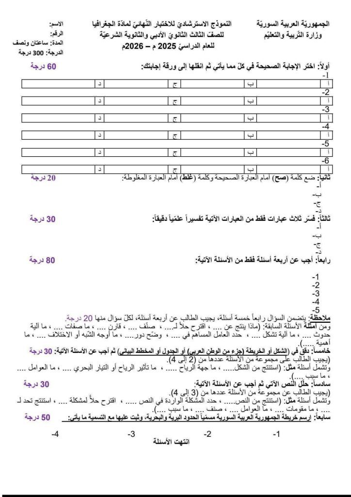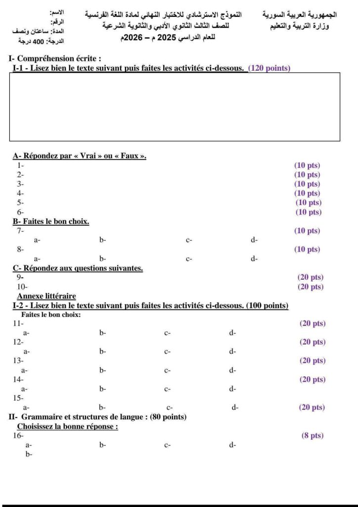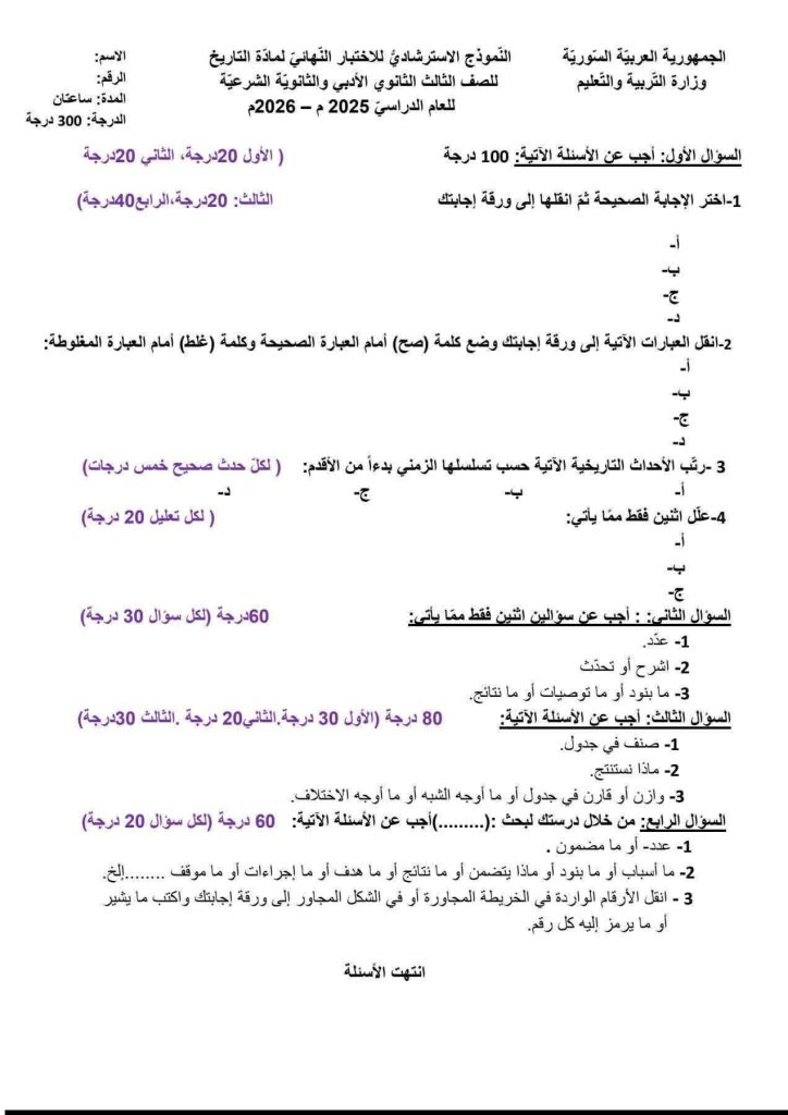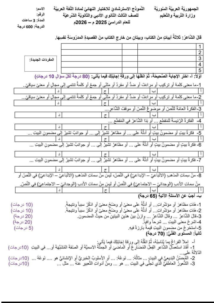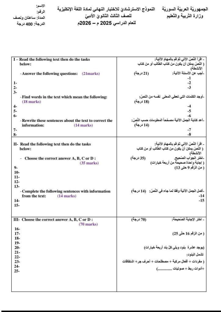 أصدرت وزارة التربية و التعليم في سوريا النماذج الرسمية لامتحانات البكالوريا أدبي 2026، وذلك بغرض تدريب الطلاب مسبقًا على نمط الامتحان الرسمي.