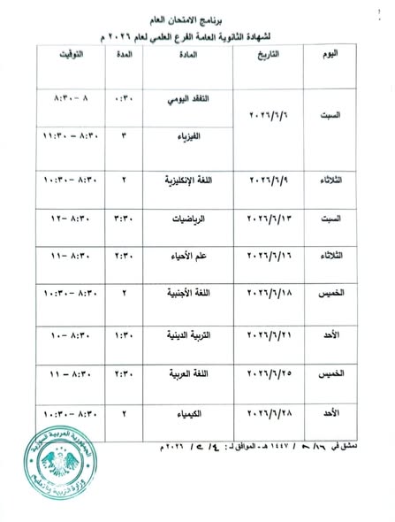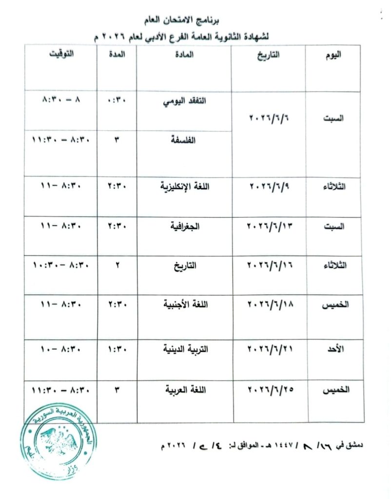أصدرت وزارة التربية والتعليم في سوريا جدول امتحانات الشهادة الثانوية العامة بكافة فروعها العلمي والأدبي والشهادة الثانوية الشرعية للعام الدراسي 2026.