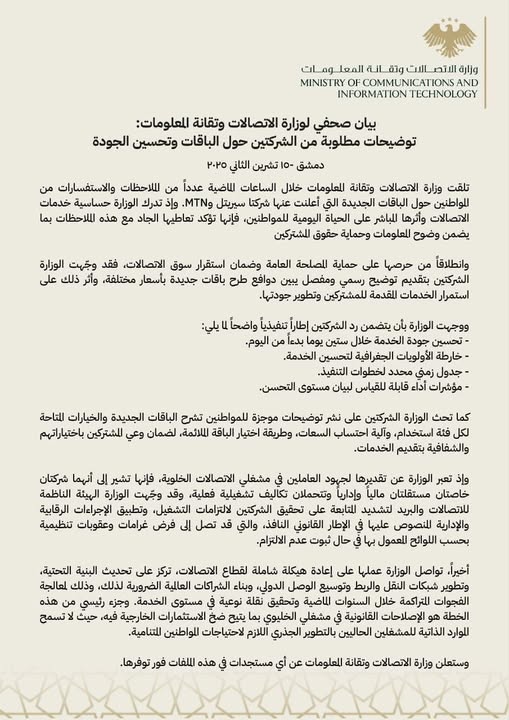 وأصدرت وزارة الاتصالات وتقانة المعلومات السورية بيانا حول الباقات الجديدة التي أعلنت عنها شركتا الاتصالات: